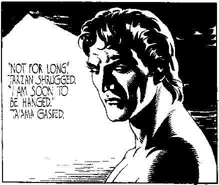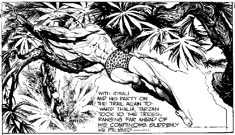 Hal Foster, the acclaimed artist of the Tarzan Sunday page who had been illustrating the strip almost since it's inception (see bio on Foster) was leaving the strip to pursue the dream of his own strip, free of the restrictions of the Tarzan character. Thus, as Foster was going over to King Features to do Prince Valiant, United Features needed a cartoonist to take over Tarzan, and this is where Hogarth just happened to be at the syndicate and was asked if he would like to try out for the job along with the other artists who were trying to get the enormously popular strip. Hogarth had been a fan of Foster's art and his sample page bore a strong resemblance. The syndicate was impressed, and Hogarth got the job. The sample page itself was published as Hogarth's first Sunday page on May 9, 1937. This made him the only cartoonist to follow both Raymond and Foster, arguably the two greatest adventure cartoonist-illustrators, on strip assignments. An interesting note: Foster's first Prince Valiant page came out on February 13 and his last Tarzan came out on May 2. Well, some papers carried both strips, overlapping Foster's work for twelve weeks. Unfortunately from the beginning, Hogarth's attempts to give the strip his own character were resisted by the syndicate editors, who didn't want to fool with a successful formula. One of these restrictions was that Hogarth had to maintain a Foster-ish style, so it wasn't until Hogarth was able to exhibit his ability to maintain Tarzan's popularity that he was allowed to develop his own look to the tarzan strip, which began to occur in late 1938. |