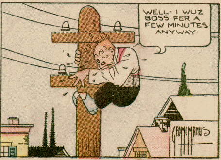 At the Journal he created several other strips, and it would be these that he is most remembered for. "Spareribs & Gravy" about a Mutt & Jeff team of world explorers, which was quite a funny strip; "Rosie's Beau"; and finally the immortal "Bringing Up Father" starring the unflapable Maggie and the ever miscievous Jiggs, which began in 1913 as an intermitent daily strip before establishing permanent status in 1916. The first Sunady episode appearing on April 14, 1918. Bringing Up Father was a conceptual burlesque of American life in the early part of this century. Maggie was an ordinary washlady and Jiggs a mason when the couple wins the Irish sweepstakes and become rich. Though Maggie's snobery might have fit nicely into her mansion, Jiggs on the other hand never pretended to be anything but a simple Irishman wanting to drink an ale at Dinty Moore's tavern and play poker at his friend's home. These opposites quite frequently led to the tossing of a rolling pin at Jiggs' head, and Jiggs' need to hide his many transgressions from his over vigilante wife. McManus was a magnificent humorist, and his daily offerings were joys to read, but there was more to this strip than humor! One of the most striking characteristics of the strip was the outstanding Art Deco backgrounding. Large chandeliers, flowing staircases, modernist designs and fabulous decorations were placed carefully throughout, and if you looked closely at the pictures on the walls you could see the characters within them moving and changing. The resulting combinations of art, design and wit made Bringiing Up Father one of the most popular comic strips of all time and appeared on the first page of Hearst's comic section for many years. It is reported to be the first comic strip that achieved fame world wide. In the 1920's, a play called "Father" made a tour of the country and McManus played the lead character in some of it's productions. In the forties, McManus turned over most of the artistic chores over to cartoonist Vern Greene, the former artist of the Shadow daily strip and brother of DC comic artist Sid Greene. McManus died October 22, 1954 in Santa Monica, California. |