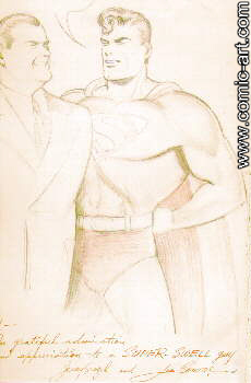 They continued to do Dr. Occult and some other DC characters through the next couple of years, all the while working on the Superman feature that they wanted to sell so bad. Finally the big break came. In 1938, as they tried to peddle the character to DC again they wound up in the office of Max Gaines, the publisher of the All American label. Max wasn't interested in Superman, but Sheldon Mayer was starting a new title at sister company DC and needed a cover feature, so he sent the pair over to the office with their hero tucked under their arms and Sheldon decided to take a shot with the Superman, giving him the cover of the first issue of Action Comics dated June 1938. Read Superman's Origin here and check out some of Joe Shuster's artwork. Superman was a smash hit with issues of Action selling out at the newsstands every month. Other companies, trying to cash in on the craze created by Superman tried to emulate the character to varying degrees. Some were successful, some were not. Some companies were even sued by DC for copying the Superman, even while DC itself copied the character without remuneration to Siegel & Shuster. But by 1941, the Saturday Evening Post reported the pair as making upwards of $75,000 each per year. They had certainly hit the bigtime. |